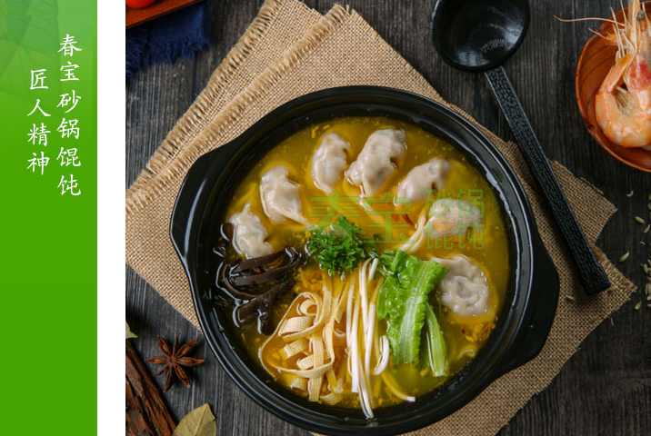 經過9999多個日夜的研究分析,誕生了將傳統砂鍋文火熬湯的工藝與現代化餛飩生產工藝完美結合的春寶砂鍋餛飩,行業獨一無二。砂鍋能均衡而持久的把外界熱能傳遞給內部餛飩,時間維持得越長,鮮香成分溢出的越多,煨出餛飩湯的滋味就越鮮醇。