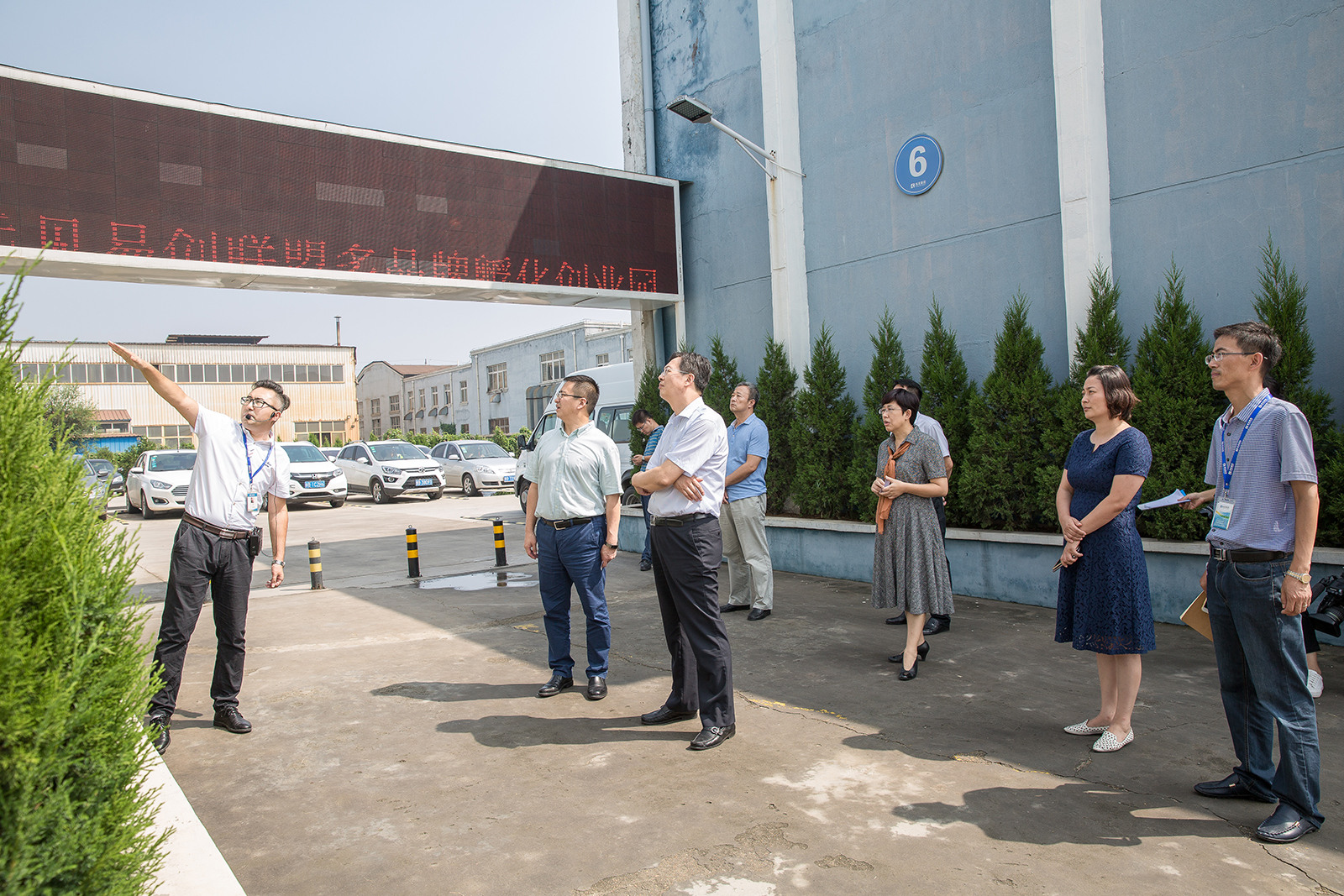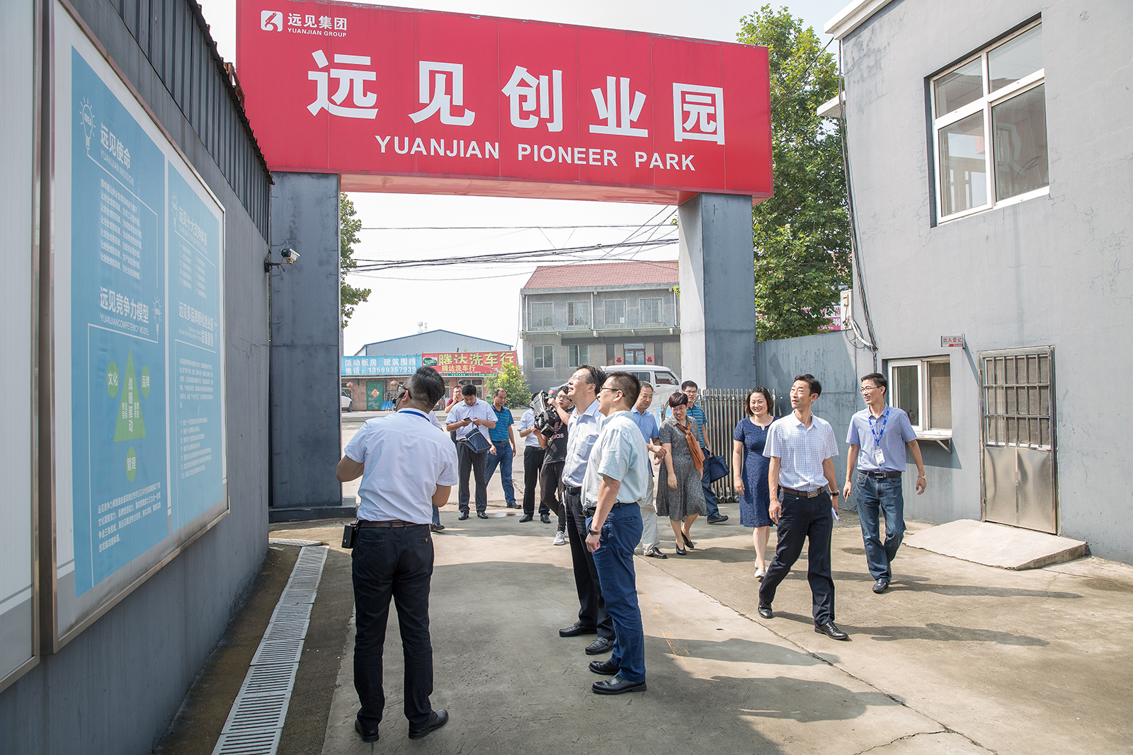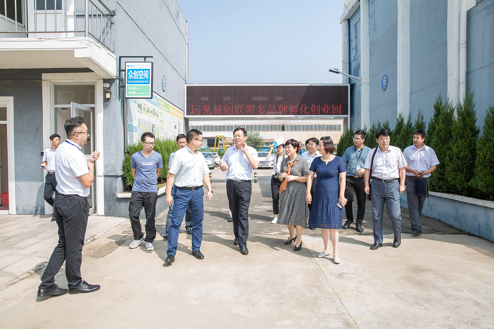 王書記一行正在聽取遠見創業園文化理念和發展歷程的介紹。